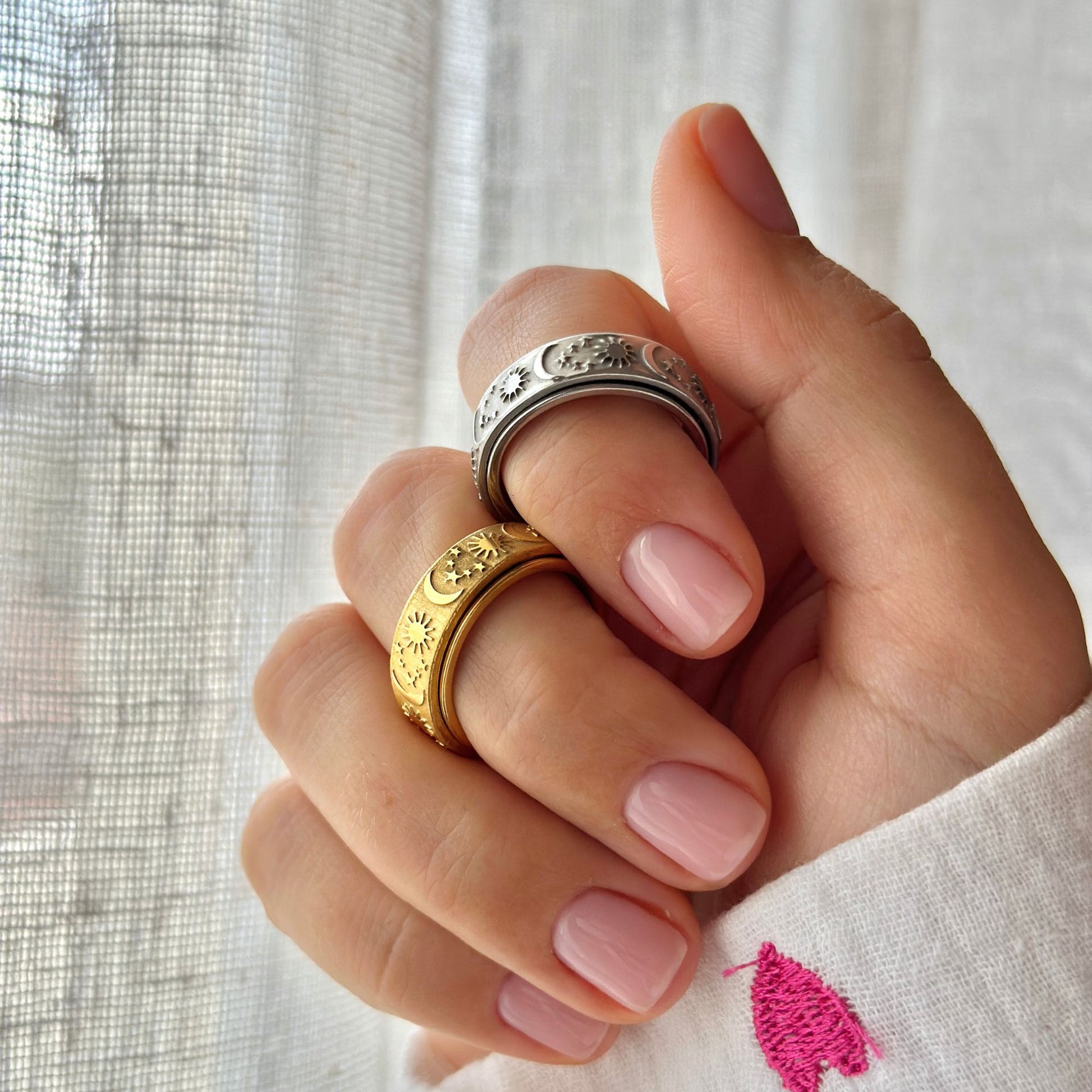 Featuring a subtle rotating band, this ring offers a soothing, tactile way to refocus your energy whenever your mind feels restless. Inspired by celestial motifs, it’s a meaningful accessory that supports moments of calm while adding a touch of cosmic elegance to your look. 🌌